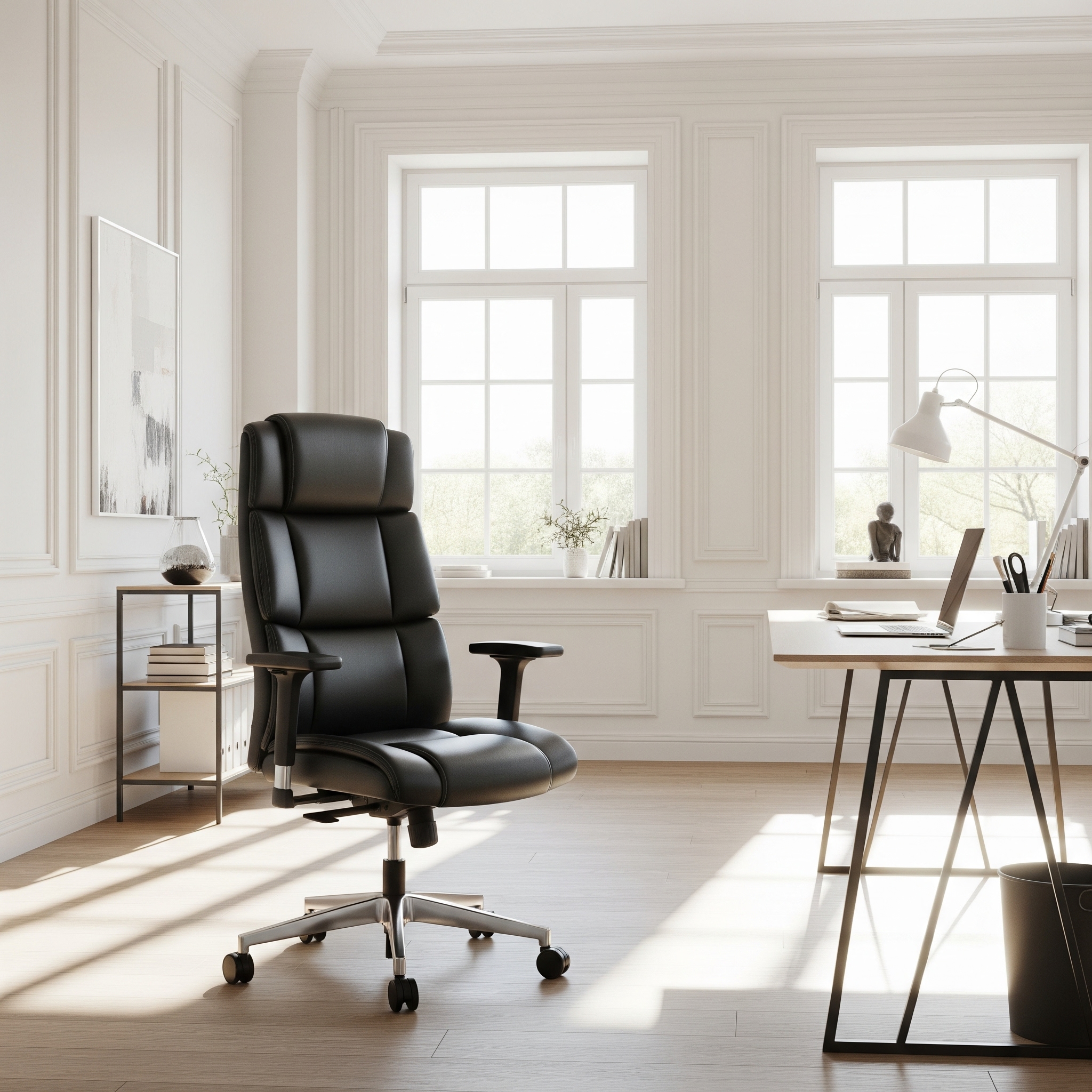 Komfortowe krzesło biurowe z wysokim oparciem. Zapewnia wsparcie podczas długiej pracy.